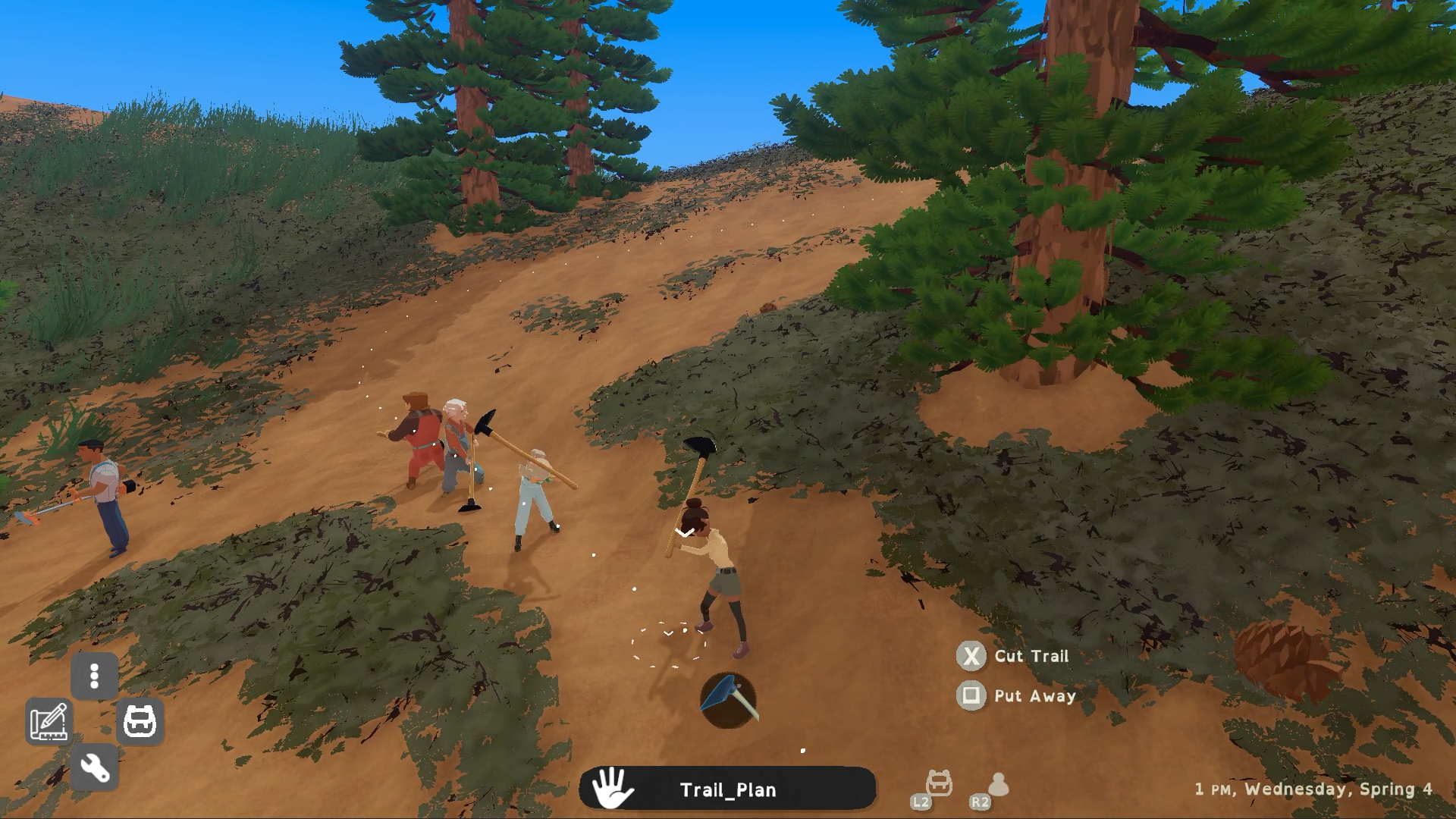 Players take on the role of a new recruit working at a rewilding camp in the mountains. The player and their crew work together to manage and restore the forest; planting trees, building trails, clearing firebreaks, tearing up pavement, and more. It’s a roleplaying game that celebrates the personal and social experience of being in nature together. Players can accomplish many tasks on their own, but it’s usually easier, faster, and more fun to work together with the other characters.