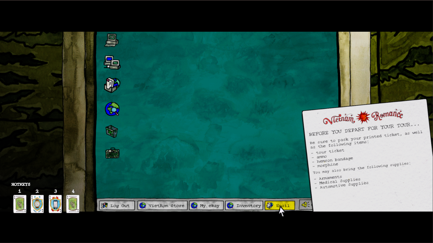 A jokey computer-within a computer interface controlled with the joystick or WASD keys. This clip demonstrates browsing by item type.The interface also features the ability to buy and sell items on your own ebay store and read emails from other characters.